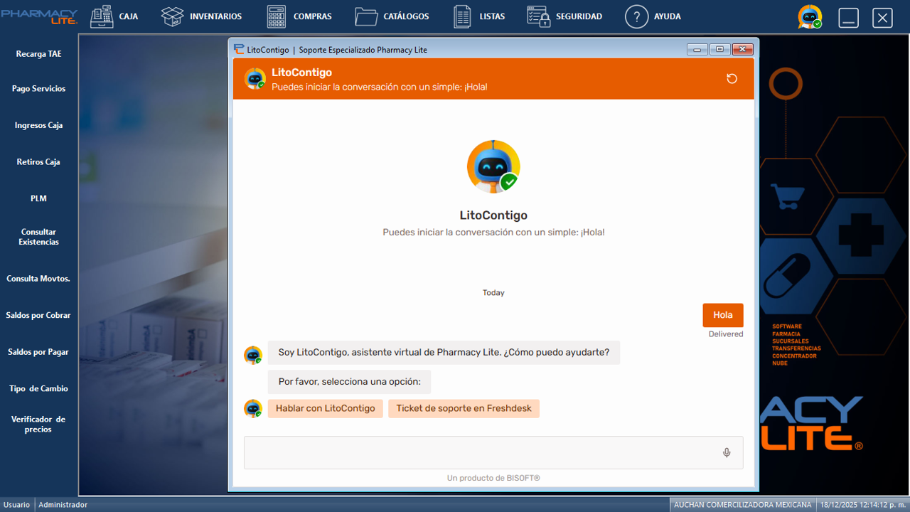 ¡Encontrarlo es muy fácil! En cuanto ingresas a Pharmacy Lite, verás el ícono de LitoContigo en la parte superior derecha de la pantalla. Solo debes dar clic y comenzar a interactuar.